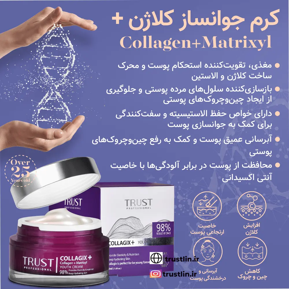 پوست ما با افزایش سن و گذشت زمان به صورت طبیعی میزان تولید پروتئین های استحکام بخش پوست کاهش یافته و پوست دچار چین وچروک میگردد و پوستمان به آبرسانی بیشتر نیاز دارد و استفاده از محصولات تخصصی ضد چروک برای همه ضروری میگردد. وجود کلاژن در کرم جوانساز کلاژن تراست علاوه بر حفظ ساختار سلول های پوستی از ایجاد چین وچروک های پوستی جلوگیری میکند. کمپلکس سرامید موجود در این محصول باعث تقویت و استحکام ساختار سلول های پوستی شده و از تخریب سلول های پوستی تحت عواملی چون تابش های مضر نور خورشید وآسیب های محیطی ، آلودگی هوا و گرمای شدید جلوگیری میکند.